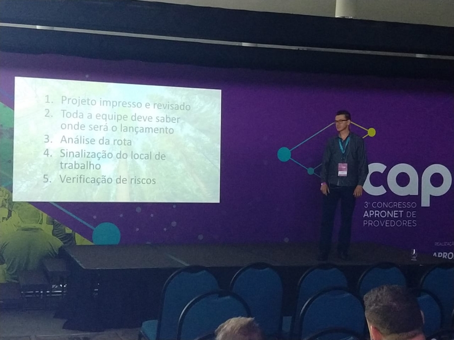 supervisor do setor de lançamento de fibra óptica, Murilo Estevão, apresentou o workshop “Boas práticas em lançamentos de redes ópticas”. O colaborador já participou de eventos onde tinha que falar para muitas pessoas, mas foi a primeira vez em que se apresentou para um grande público numa realização mais técnica.