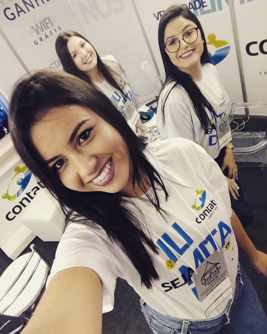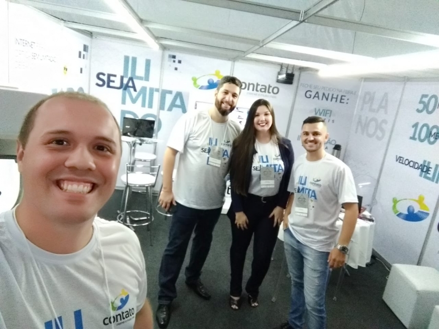 E a super equipe de consultores de vendas da Contato está a mil por hora interagindo com o público e levando mais informação sobre seus planos de internet e vantagens de seus serviços em um estande na feira.